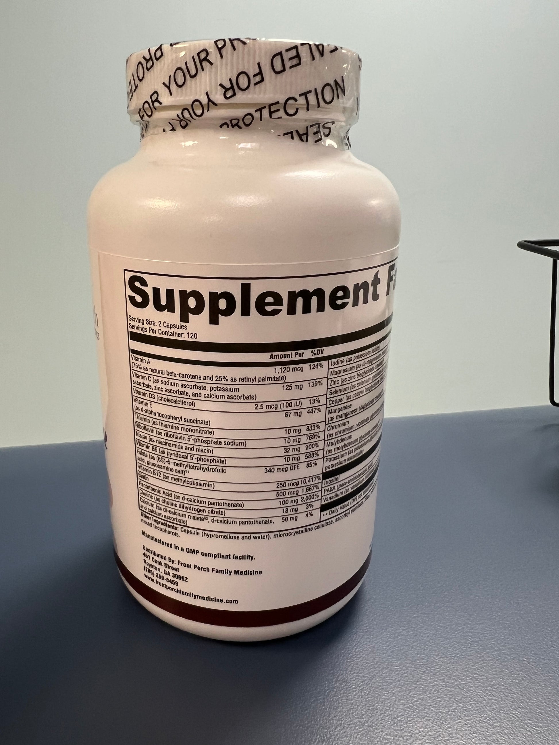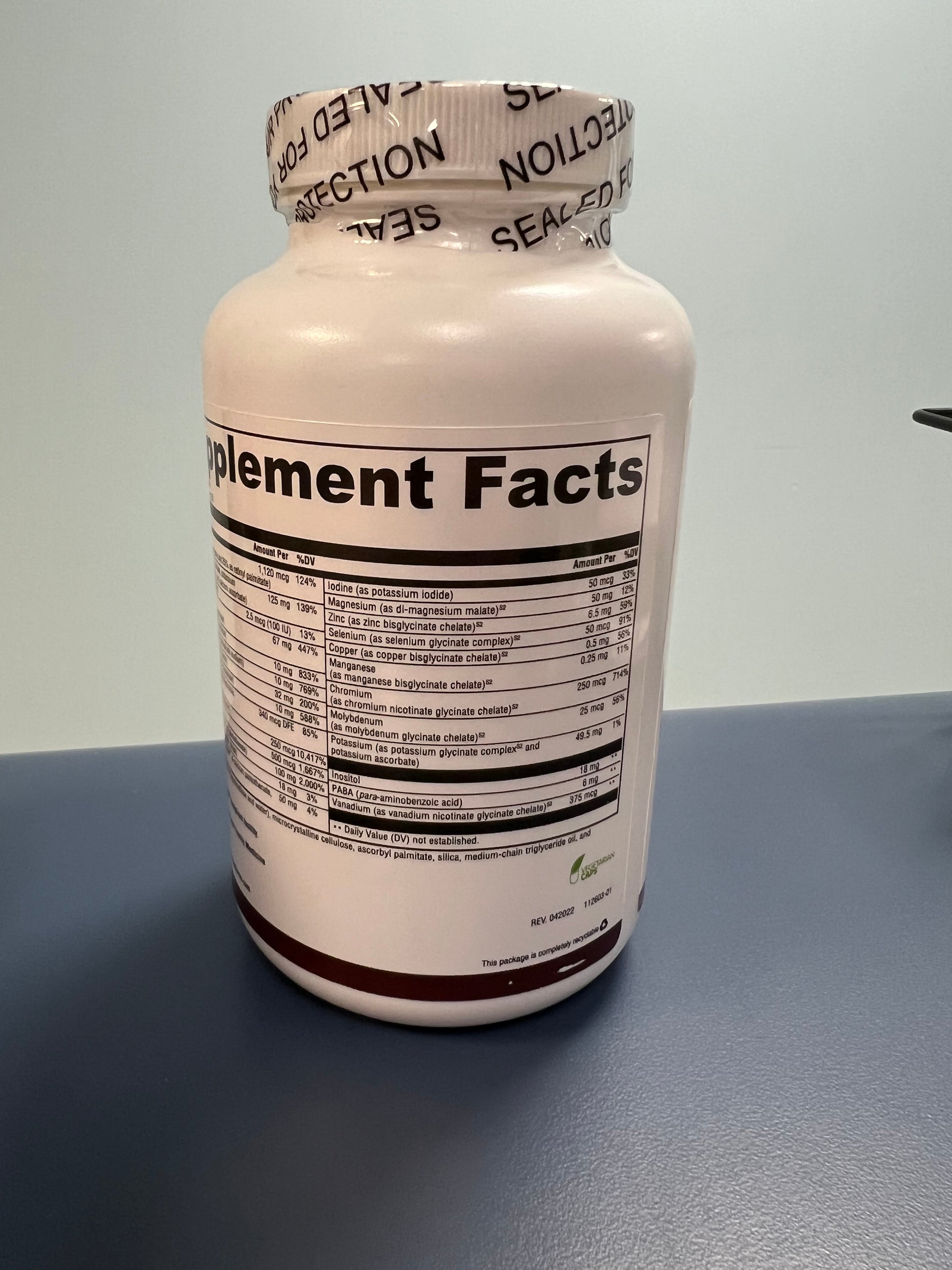 Main Ingredients: Vitamin A, Vitamin C, Vitamin D3, Vitamin E, Thiamin, Riboflavin, Niacin, Vitamin B6, Folate, Vitamin B12, Biotin, Pathothenic Acid, Chlorine, Calcium, Iodine, Magnesium, Zinc, Selenium, Copper, Manganese, Chromium, Molybednum, & Potassium